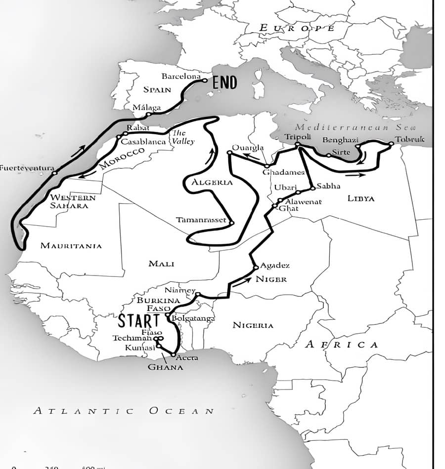 Ousman Umar starts his story in a small village in Ghana. At a young age, he decides to embark on a perilous journey to Europe, driven by the hope of finding opportunities that are scarce in his homeland. His path takes him through Togo, Burkina Faso, Niger, and into the unforgiving expanse of the Sahara Desert.